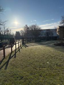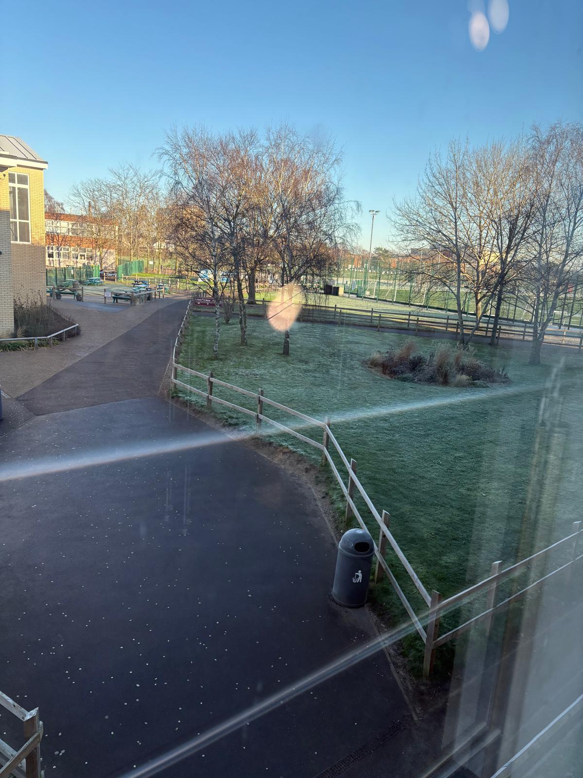 A bitterly cold, crisp morning on our campus, which looked stunning in the bright early morning sunshine. Most of our car thermometers told us it was -5 deg C or below!